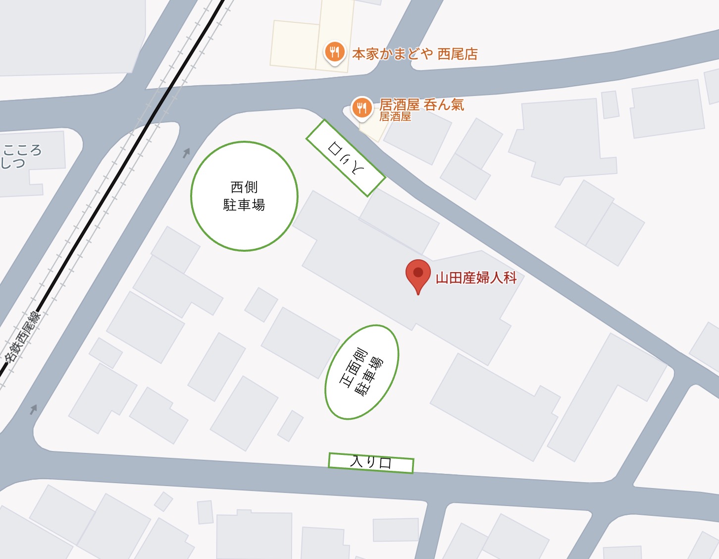 山田産婦人科は名鉄西尾線西尾口駅から約4分の便利な場所にございます。